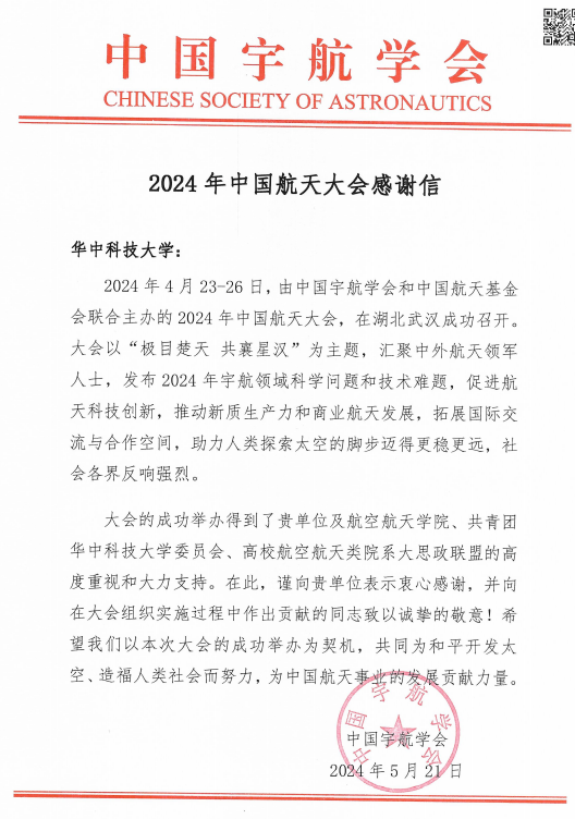 5月21日,中国宇航协会向我校发来感谢信,对我校及金沙威尼斯欢乐娱人城、共青团金沙威尼斯欢乐娱人城委员会、高校航空航天类院系大思政联盟给予2024年中国航天大会的高度重视和大力支持表示感谢。