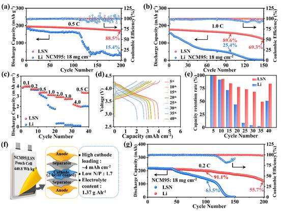 图5. (a,b) NCM95||LSN与NCM95||Li纽扣电池在0.5 C (a)和1.0 C (b)下的循环性能。(c) NCM95||LSN与NCM95||Li纽扣电池在0.1-4.0 C电流密度变化下倍率性能。(d) NCM95||LSN纽扣电池在倍率性能测试期间,特定循环次数下的恒电流充放电曲线。(e) NCM95||LSN与NCM95||Li纽扣电池在倍率性能测试中特定循环次数下的容量保持率。(f)采用高正极载量(4 mAh cm-2)、低N/P比(1.7)和贫电解液用量(1.37 g Ah⁻¹)的NCM95||LSN软包电池结构示意图。(g) NCM95||LSN与NCM95||Li软包电池经0.1 C活化三圈后在0.2 C下的长循环性能测试。