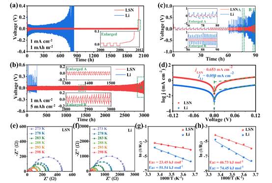 图2. (a,b) LSN||LSN和Li||Li对称电池在1 mAh cm⁻²(a)和5 mAh cm⁻²(b)电流密度下进行恒电流锂剥离/沉积循环的电压-时间演变曲线。(c)固定容量为1 mAh cm⁻²时,LSN||LSN和Li||Li对称电池的倍率性能。(d) LSN||LSN和Li||Li对称电池的Tafel曲线。(e,f) LSN||LSN (e)和Li||Li (f)对称电池在273至298 K不同温度下的拟合Nyquist图。(g,h)根据LSN||LSN和Li||Li对称电池Nyquist图拟合得到的