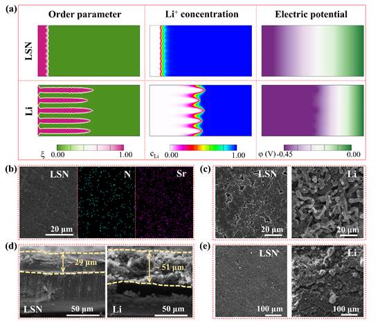 图4. (a) LSN电极与纯锂电极表面锂沉积动力学的相场模拟,通过序参数(