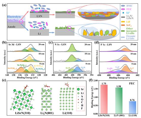图1. (a) FEC分子与LSN电极及纯锂电极表面相互作用示意图。(b-d)循环3圈后LSN阳极的Sr 3d (b)、N 1s (c)和F 1s (d)高分辨率XPS谱图。(e,f) FEC分子吸附在LiSrN(310)、Li₃N(001)和Li(110)表面的DFT模拟slab模型(e),及相应的结合能计算结果(f)。