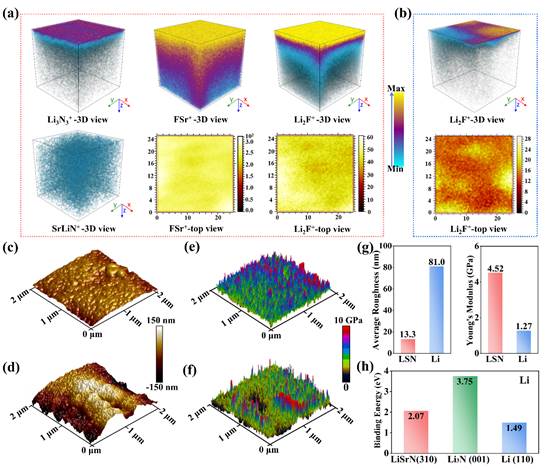 图3. (a)循环后LSN电极体相及表面关键成分(Li3N3+, FSr+, Li2F+, SrLiN+)分布的TOF-SIMS元素映射图。(b)循环后纯锂电极体相及表面Li2F+分布的TOF-SIMS元素分布图。(c,d) LSN电极(c)和纯锂电极(d)中SEI的典型AFM形貌。(e,f) LSN电极(e)和纯锂电极(f)中SEI的杨氏模量分布图。(g) LSN与纯锂阳极SEI的平均粗糙度和杨氏模量对比。(h) DFT计算得到的LiSrN(310)、Li₃N(001)和Li(110)表面吸附Li的结合能。